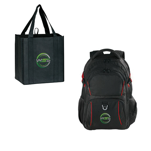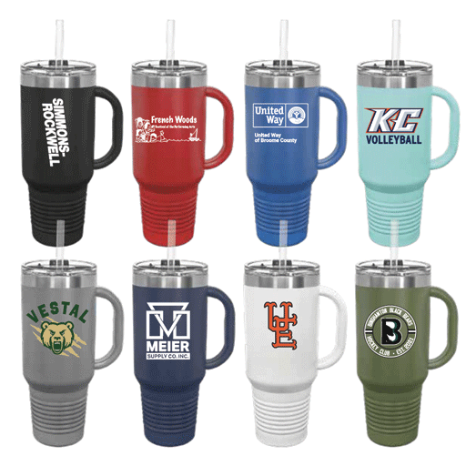 Stickers ,Travel Mugs, Coffee Mugs, Paper Cups, Pins, Pens, Wine Openers, Umbrellas, Water Bottles, Backpacks, Duffle Bags, Device Chargers, Flasks